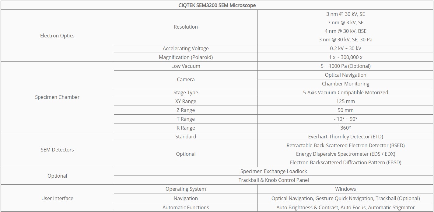 The CIQTEK SEM3200 SEM Microscope is an excellent general-purpose Tungsten Filament Scanning Electron Microscope (SEM) with outstanding overall capabilities. Its unique Dual-anode electron gun structure ensures high resolution and improves image signal-to-noise ratio at low excitation voltages. Furthermore, it offers a wide range of optional accessories, making the SEM3200 a versatile analytical instrument with excellent expendabilities.
